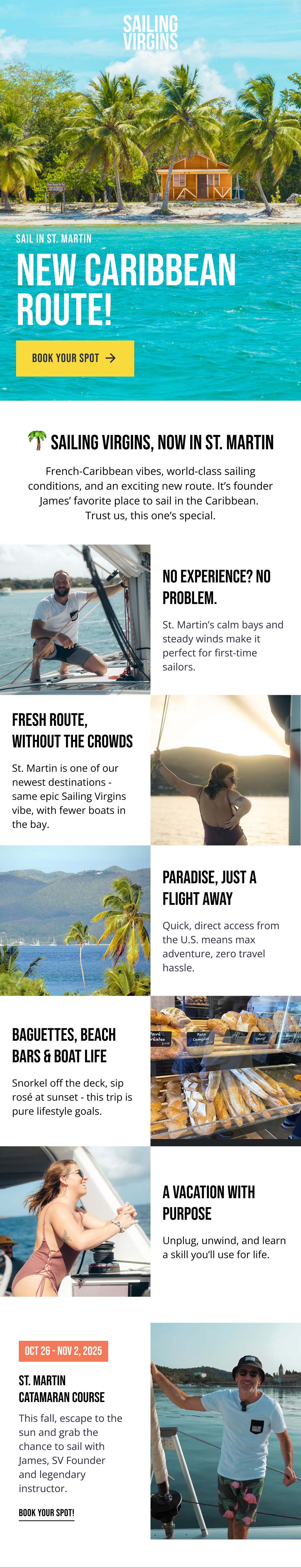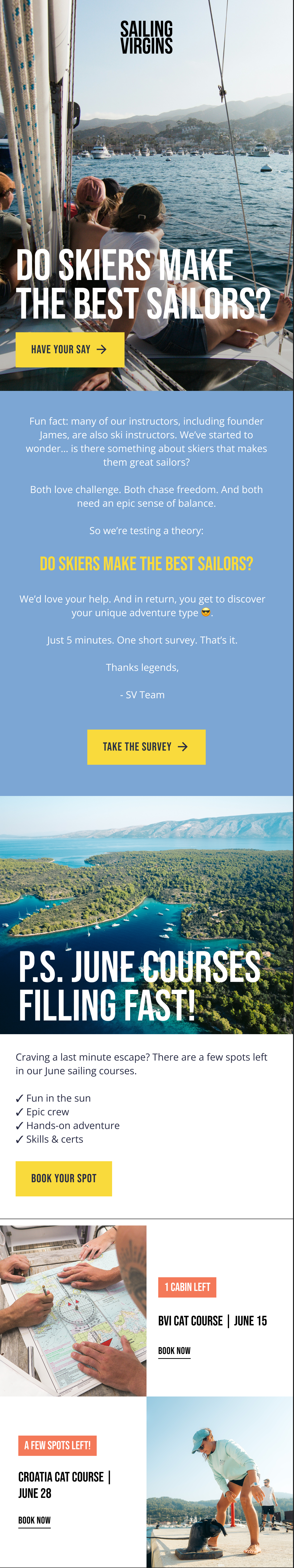In early 2025, Dua Mani began a partnership with Sailing Virgins to conceptualise and lead the launch of its “Adventurer” campaign - a new business vertical aimed at outdoor enthusiasts seeking off-season adventure. With a minimal paid media budget, we focus on smart, scrappy execution: from SEO-driven blog content to social reels, email campaigns, and partnerships, the goal was clear: drive awareness, grow leads, and book more sailing courses - without relying on a bloated media budget.